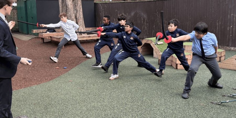 Following Macbeth’s success as last year’s summer play, and the more recent Form 8 production of The Three Musketeers in French, it was only a matter of time before someone asked the question, why not give the boys real swords? Apparently, this is considered unwise, but Mrs Fairhurst found the next best thing: the British Fencing Core Coaching Programme.